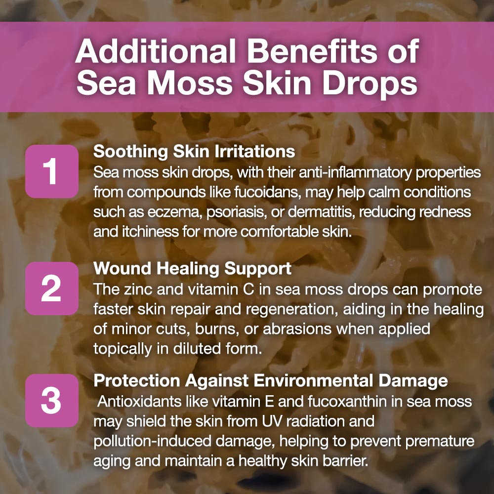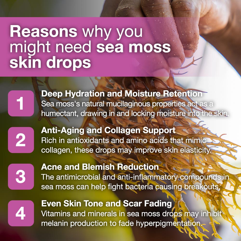 Introducing Sea Moss Skin Drops – a beautifying daily elixir designed to enhance skin radiance, hydration, and elasticity from within.